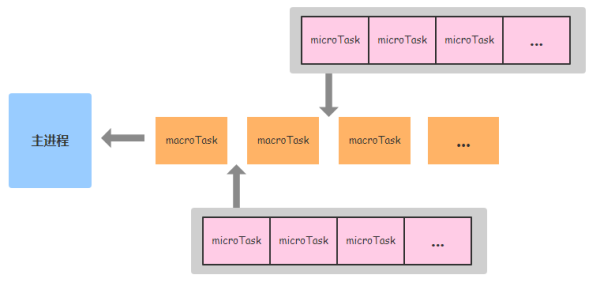 典型的 MacroTask 包含了 setTimeout, setInterval, setImmediate, requestAnimationFrame, I/O, UI rendering 等,MicroTask 包含了 process.nextTick, Promises, Object.observe, MutationObserver 等。 二者的关系可以图示如下: